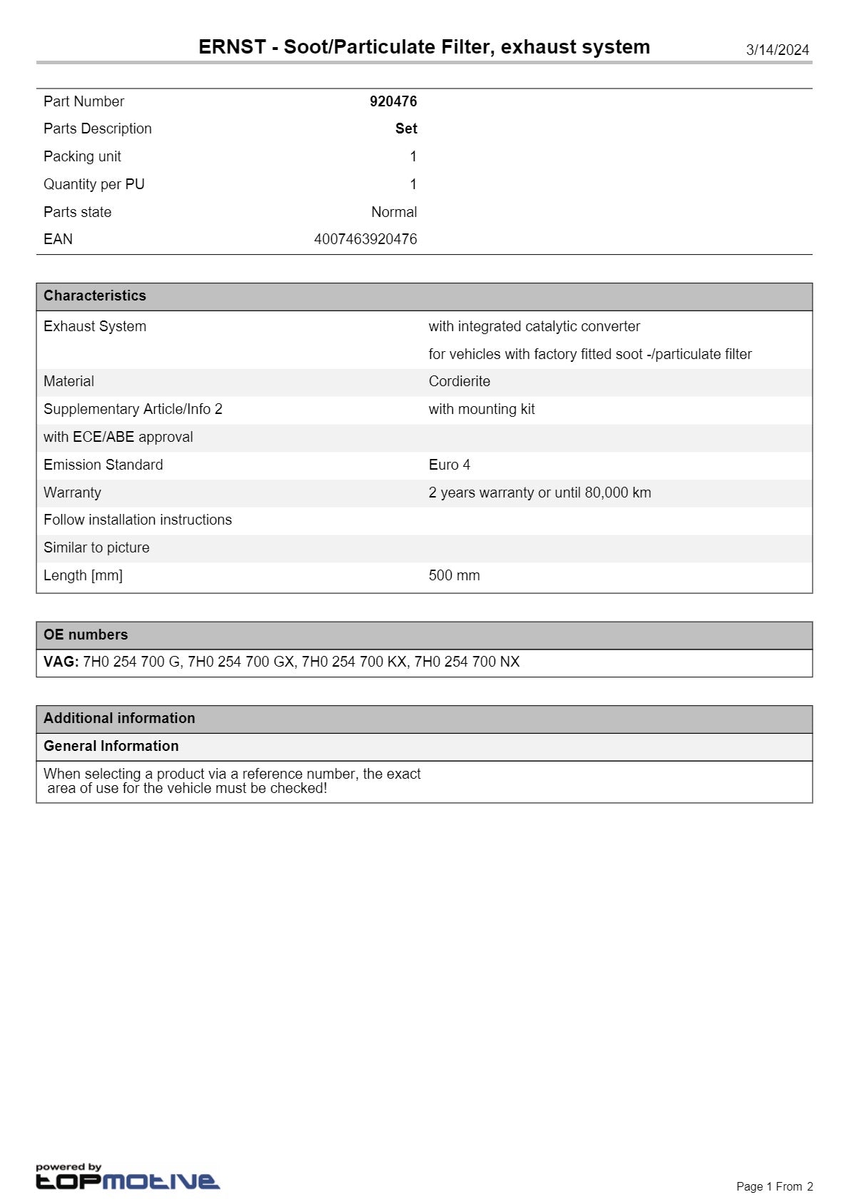 Optimize emissions control and system reliability with the Diesel Particulate Filter (DPF) Kit for VW. Manufactured by Ernst, this Euro 4-compliant filter includes an integrated catalytic converter and mounting kit, designed for vehicles originally equipped with factory-fitted particulate filters.