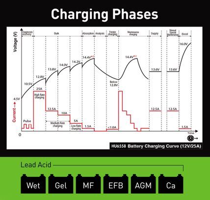 - Charges all battery types including Lead Acid, GEL, MF, EFB, AGM and Calcium