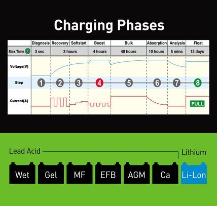 - Charges all battery types including Lead Acid, GEL, MF, EFB, AGM, Calcium and Lithium